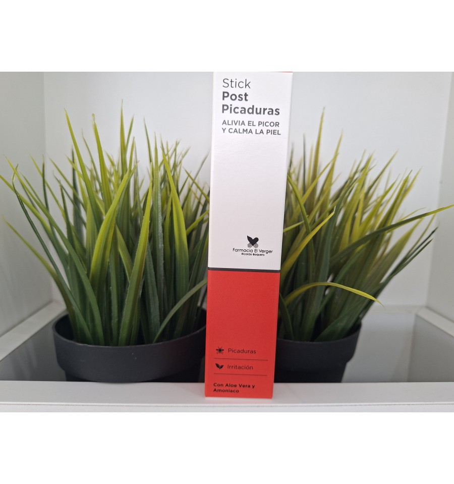 STICK POST PICADURAS. ALIVIA EL PICOR Y CALMA LA PIEL. PICADURAS E IRRITACIÓN. CON ALOE VERA , PASIFLORA, PIÑA Y AMONÍACO. APLICAR INMEDIATAMENTE PARA MAXIMIZAR SU EFECTO. ADVERTENCIA: NO APLICAR SOBRE IRRITACIONES CAUSADAS POR MEDUSAS NI EN ABRASIONES O PIEL INFLAMADA. NO APTO PARA PIELES SENSIBLES.