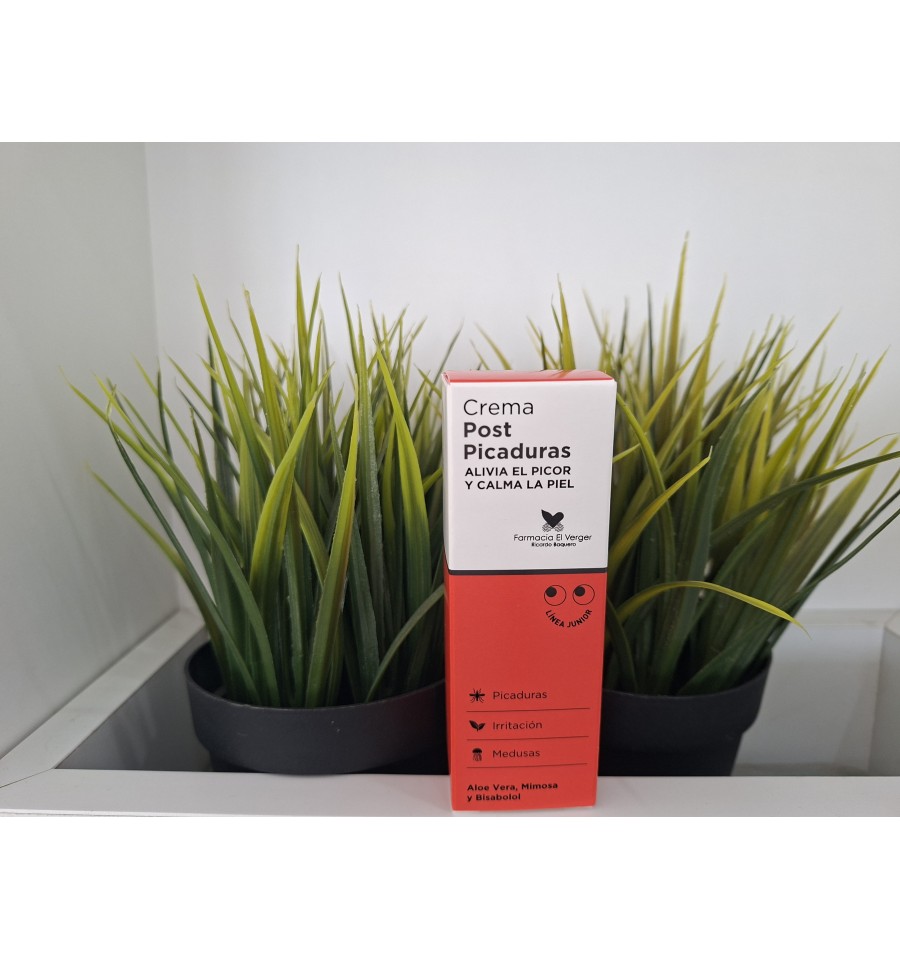CREMA POST PICADURAS. ALIVIA EL PICOR Y CALMA LA PIEL. CONTIENE ALOE VERA, MIMOSA Y BISABOLOL. EMULSION LIGERA. RESTABLECE EL EQUILIBRIO CUTÁNEO Y ALIVIA EL PICOR DE LA PIEL EN ADULTOS Y NIÑOS EN CASO DE MOLESTIAS POR AGENTES EXTERNOS, PICADURAS DE INSECTOS Y CONTACTO CON MEDUSAS O PLANTAS URTICANTES. SIN PERFUME. NO APLICAR SOBRE HERIDAS, SOBRE PIEL DAÑADA O MUY INFLAMADA